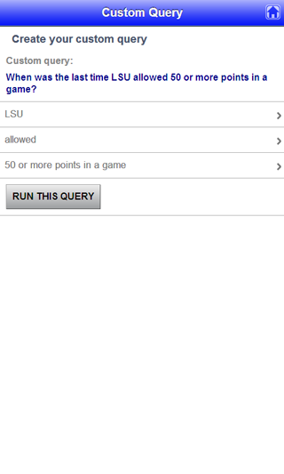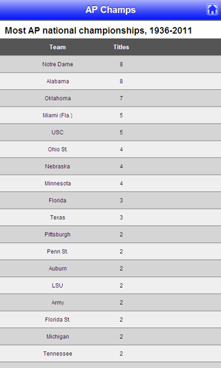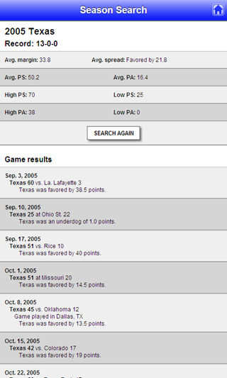 You know those crazy stats the run along the bottom of the flatscreen throughout GameDay? This app lets you dig for information like that yourself. When was the last time Notre Dame scored 50 points in a game? The last time USC lost a bowl game? How long has it been since SMU beat Texas? The answers are here. (This feature not available in free version of the app.)