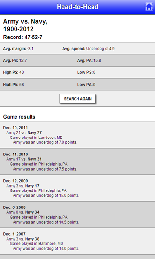 Select two teams and find historical results, trends, and bragging rights. (This feature not available in free version of the app.)