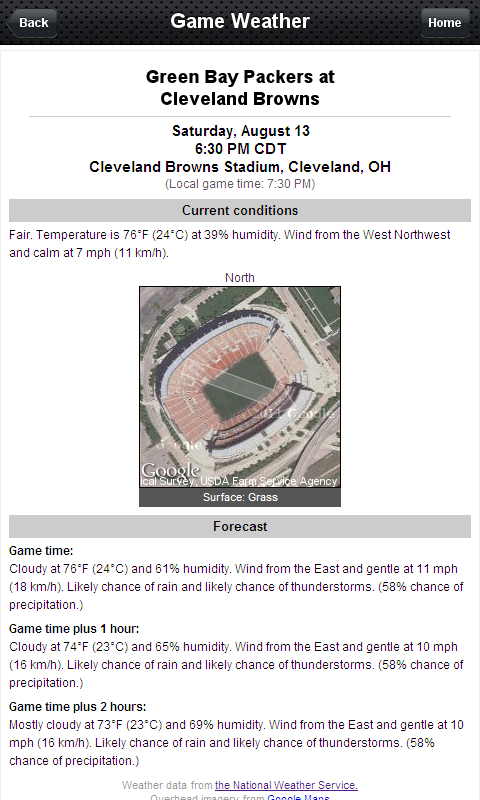 Stadium Weather provides current weather conditions, game time forecasts and overlay-enhanced satellite images for major North American sports leagues up to 7 days in advance of regular-season and playoff games. Get a fast, clear idea of how, when and where wind and weather may affect play.