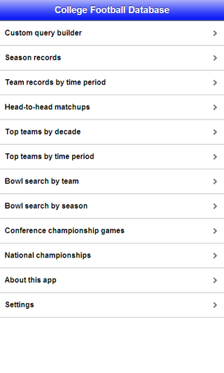 You know those crazy stats the run along the bottom of the flatscreen throughout GameDay? This app lets you dig for information like that yourself. When was the last time Notre Dame scored 50 points in a game? The last time USC lost a bowl game? How long has it been since SMU beat Texas? The answers are here. (This feature not available in free version of the app.)